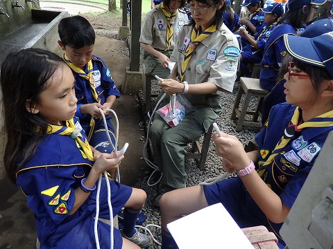 くまスカウトからしかスカウトへ えび結びを教えます。