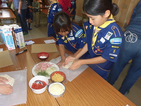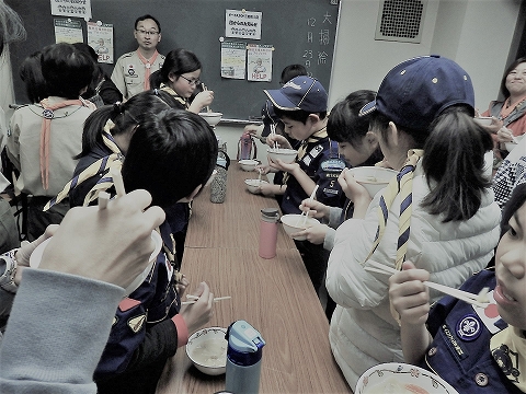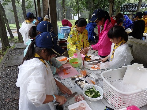 その頃、育成会の皆さんが昼食づくりと夕食作りのお手伝いに来てくださいました。スカウトがプログラムに集中できるのは そんな協力があってからこそです。本当に感謝しています。