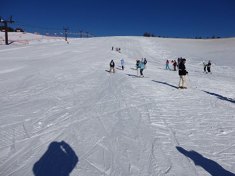 まずは準備体操。そして斜面を歩いて登り、ためしすべりをします。