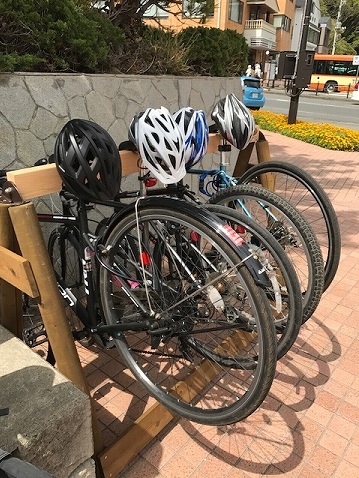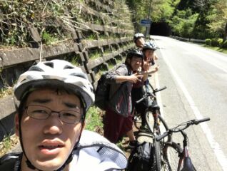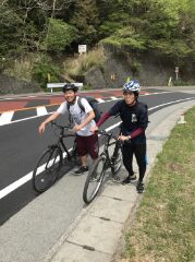 坂を登って休憩。(押して歩いたIとI)