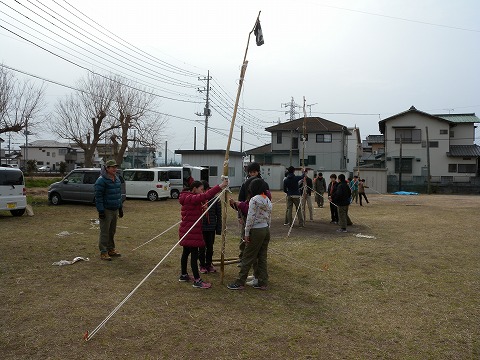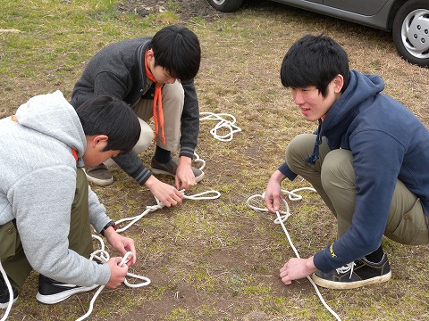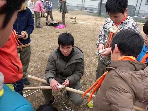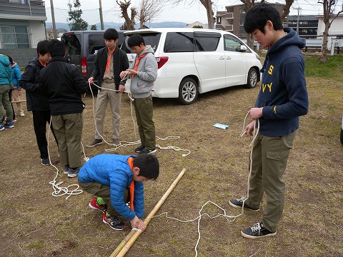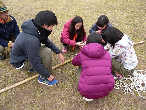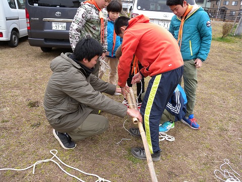 技術指導の中には「班旗立てゲーム」で使うロープワークもあり